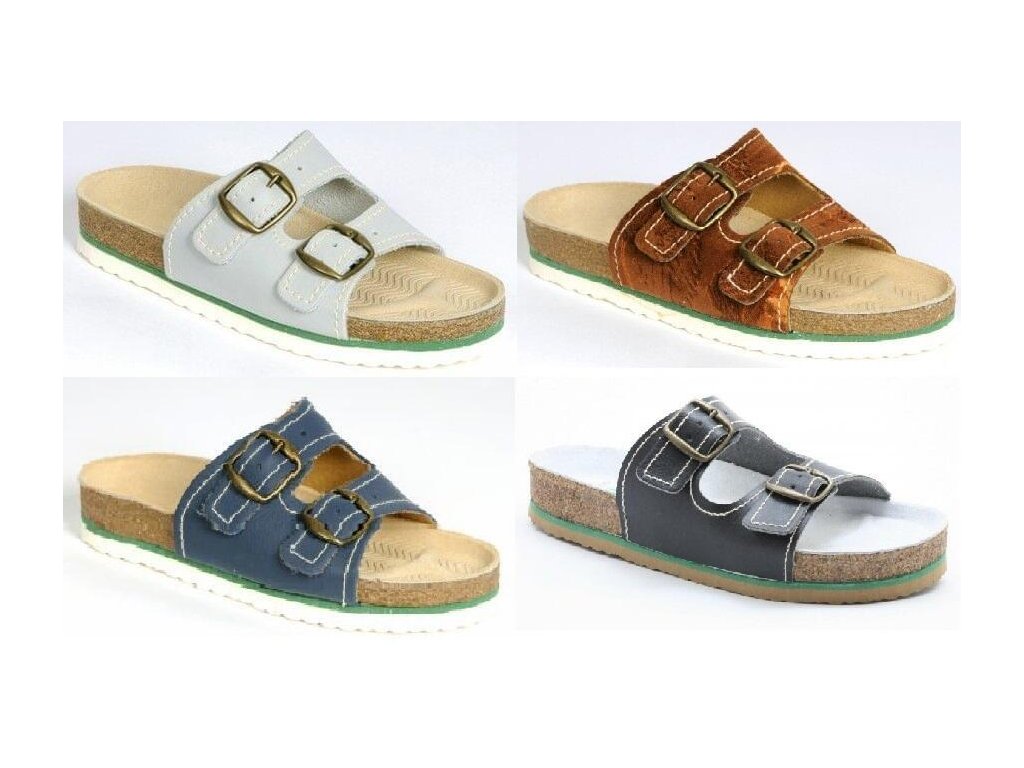 Český výrobek. Svrchový materiál nabízíme v mnoha barevných provedeních a ze zdravotně nezávadného syntetického materiálu. Stélka je profilovaná a kožená. Podešev je vyrobena z čistě přírodního korku. Zelená mezipodešev tlumí rázy při došlapu, čímž chrání páteř a klouby. Sanitární pryžová vrstva neznačkuje a neklouže, je vhodná pro domácí i venkovní použití. Obuv podporuje podélnou i příčnou klembu chodidla.Doplňkové parametry